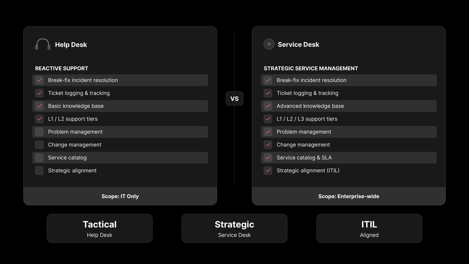 The key differentiator is not simply “giving non-IT teams a ticketing system.” Any helpdesk can do that. The differentiator is unified service delivery: shared processes, cross-department automation, and enterprise-wide visibility, all from a single platform rather than a patchwork of departmental tools.