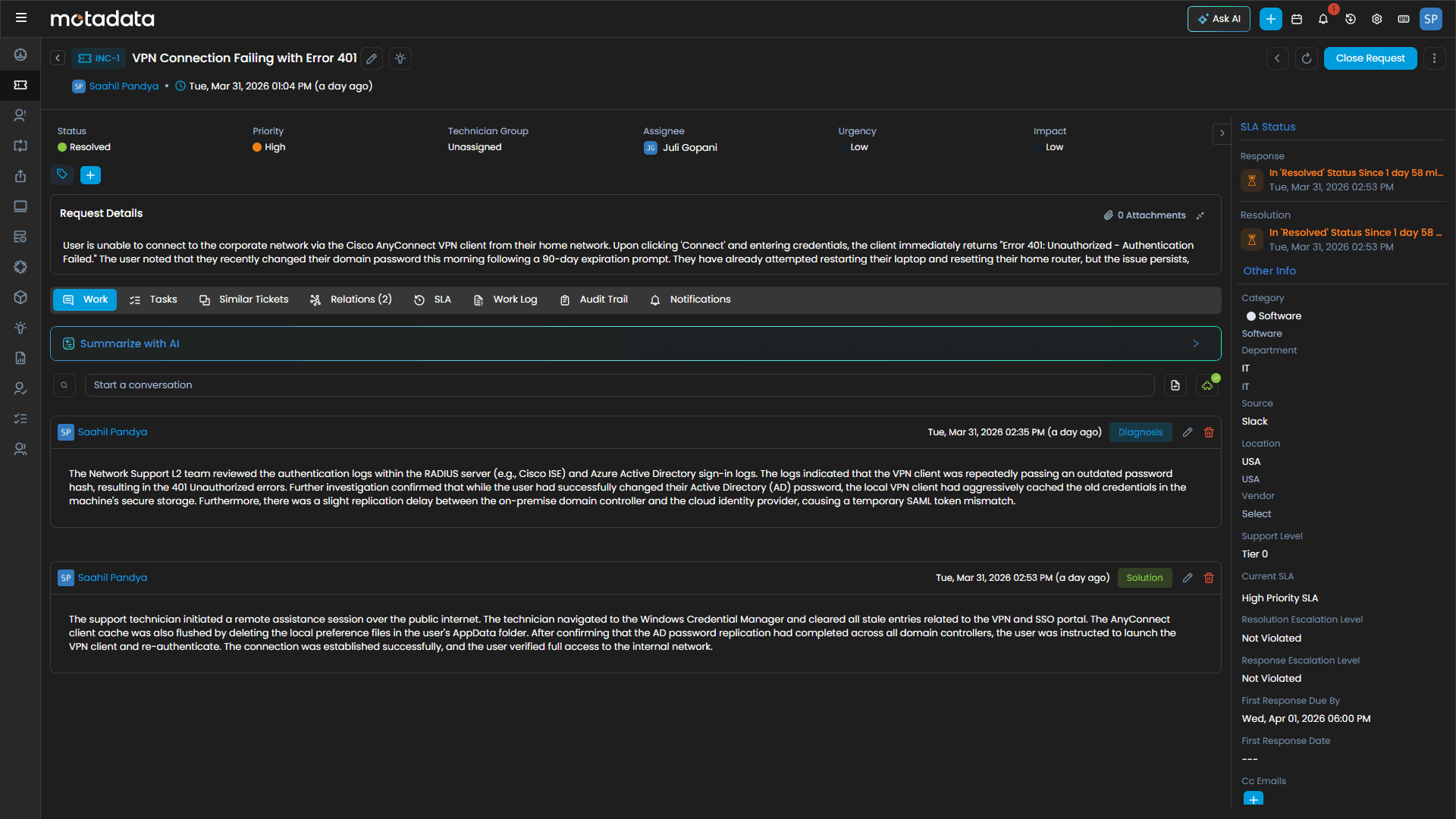 Run incident, problem, change, and service request workflows with shared context and standardized outcomes.