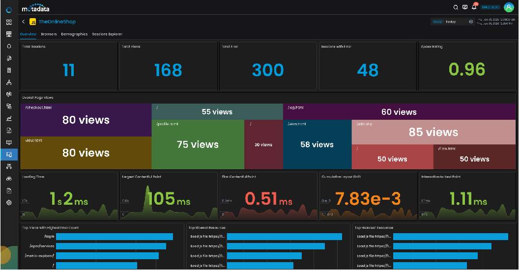 Enterprises must understand how real users experience their applications across geographies, devices, browsers, and networks. Motadata captures live user sessions, Web Vitals, interactions, errors, and rendering behavior at scale — transforming raw UX events into actionable insight. Digital and IT leaders gain continuous visibility into the true customer experience, not just backend performance.